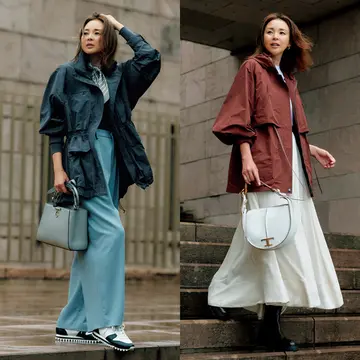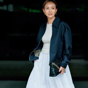 スタイリスト・村山佳世子さんが、大人のブルゾンスタイルを提案。「着るだけでおしゃれ上級者に見えて、きれいめスタイルのハズしにも便利なミリタリージャケット。こんなきれい色ならほどよくフェミニンで柔らかい印象に装えます」。