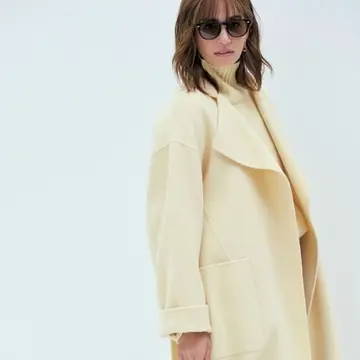 リバーコートながら適度に厚みがあり、構築的なフォルムに。その厚みのおかげで寒い真冬も安心。強さを備えた発色のよいブルーは、フェミニンな色が苦手な人でも取り入れやすい。モノトーンの服にキリリと効かせて。