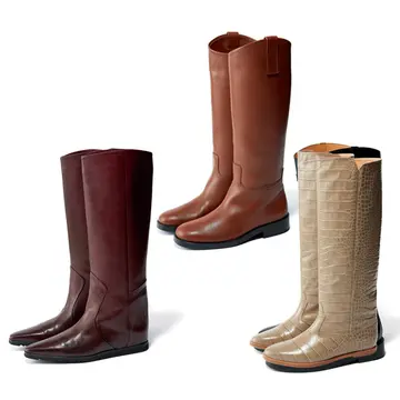 辛口なシルエットや色のスカートに注目が集まる今季。カーキ色の太幅プリーツスカートで、クラシカルかつクールに装って。やや短めのスカート丈がロングブーツとベストなバランスで決まる。