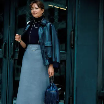 スカート¥165,000・ニット¥60,500/ブラミンク サングラス¥41,800/アイヴァン 東京ギャラリー(アイヴァン) イヤリング¥52,800/ドゥロワー 二子玉川店(グーセンス パリ) ネックレス¥75,900/エスケーパーズオンライン(ソフィー ブハイ) バッグ¥63,800/エリオポール代官山(ザンケッティ) 靴¥152,900/トッズ・ジャパン(トッズ)