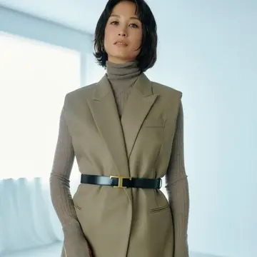 ソフトなウールのセットアップに細めのベルトがしなやかなアクセントに