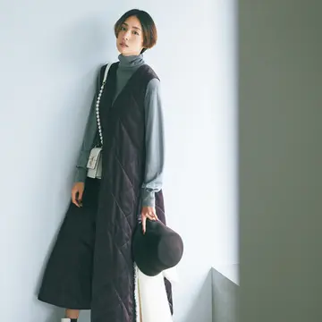ジレやベストなどノースリーブアイテムの「下に重ねる」と、相性のよいハイゲージタートルニット。ボルドーのニットに、グレーやネイビーなど冬の配色を反映させて、コーデに奥行きを。