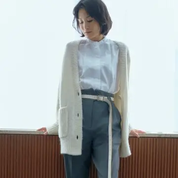 ロープベルトでブラウジングさせれば、ボリュームニットも都会的に。レザーのキャメルは、さし色にしたパンツのイエローとも好相性。そのかけ合わせが派手さを抑え、大人にふさわしい優雅なたたずまいを演出。