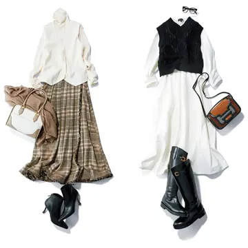 長め丈のニットベストをいつものコーデの「上に重ねる」ことで、体型カバーもしゃれ見えもかなえる。ゆったりAラインのニットベストは、同系色のニットパンツを合わせてセットアップ風の着こなしに。