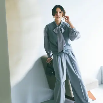 ゆったり身幅&長め丈の深Vネックベストは、同系色のニットパンツと色を合わせて、セットアップ風の着こなしに。着丈が長めだからヒップやおなかまわりもしっかりカバー。圧縮ウールで温かさも格別。
