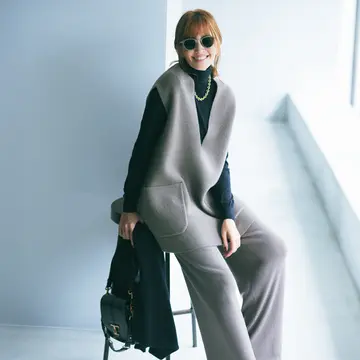 ボリューミーな首もとで小顔効果! ニットベストを着こなしの主役に
