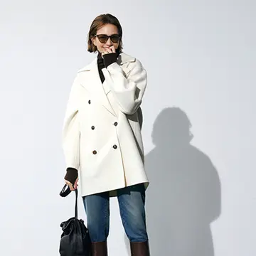 ストールといえど、長さもボリュームもたっぷりなアウター感覚の逸品が、冬の白ならではの女らしさとモダンさを両立。ラフにひと巻きするだけで、顔映りをぱっと明るく、コーディネート全体をクラスアップしてくれる。白を一点さすことで縦ラインが強調され、すらりと見える視覚効果も期待。