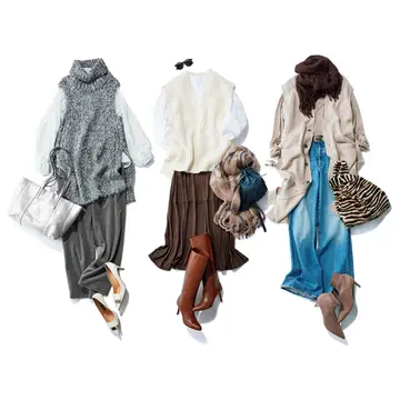 いつものニットスタイルが見違えるファージレを投入。自然なオフホワイトの色みが、ファーの柔らかな魅力を引き立てる。上からベルトをしてスタイルアップを。