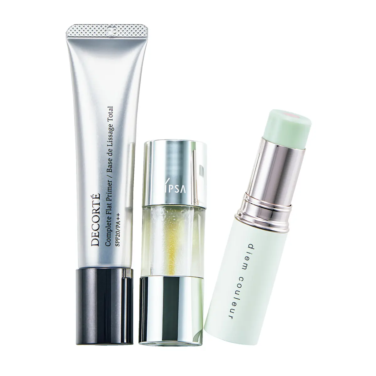 (右ディエム クルール グローブラッシュスティック 8.5g(8/22発売)¥3,800/ポーラ (中)オイルベース。クリエイティブ オイル(シアーゴールド)15㎖(9/4発売)¥2,500/イプサ (左)コンプリート フラット プライマー SPF20・PA++ 30g(8/21発売)¥3,000/コスメデコルテ -