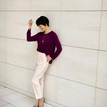 そんなパープルのニットにベビーピンクのパンツを合わせて、春らしいコーデにしてみました。
