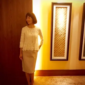 今回の場所は緑あふれる八芳園でしたので、レースのトップスと膝丈タイトスカートというシンプルで上品なオフホワイトのワントーンコーディネートにしてみました。(・・・っていっても外の新緑写ってませんから~~(笑))