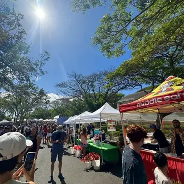 「BOGART’S CAFE」を後にして、KKCファーマーズマーケットへ。このマーケットはカピオラニコミュニティーカレッジで毎週土曜日の朝7時半から11時まで開催されています。少し出遅れた私達が到着した頃には駐車場はほぼ満車に近い状態でした。
