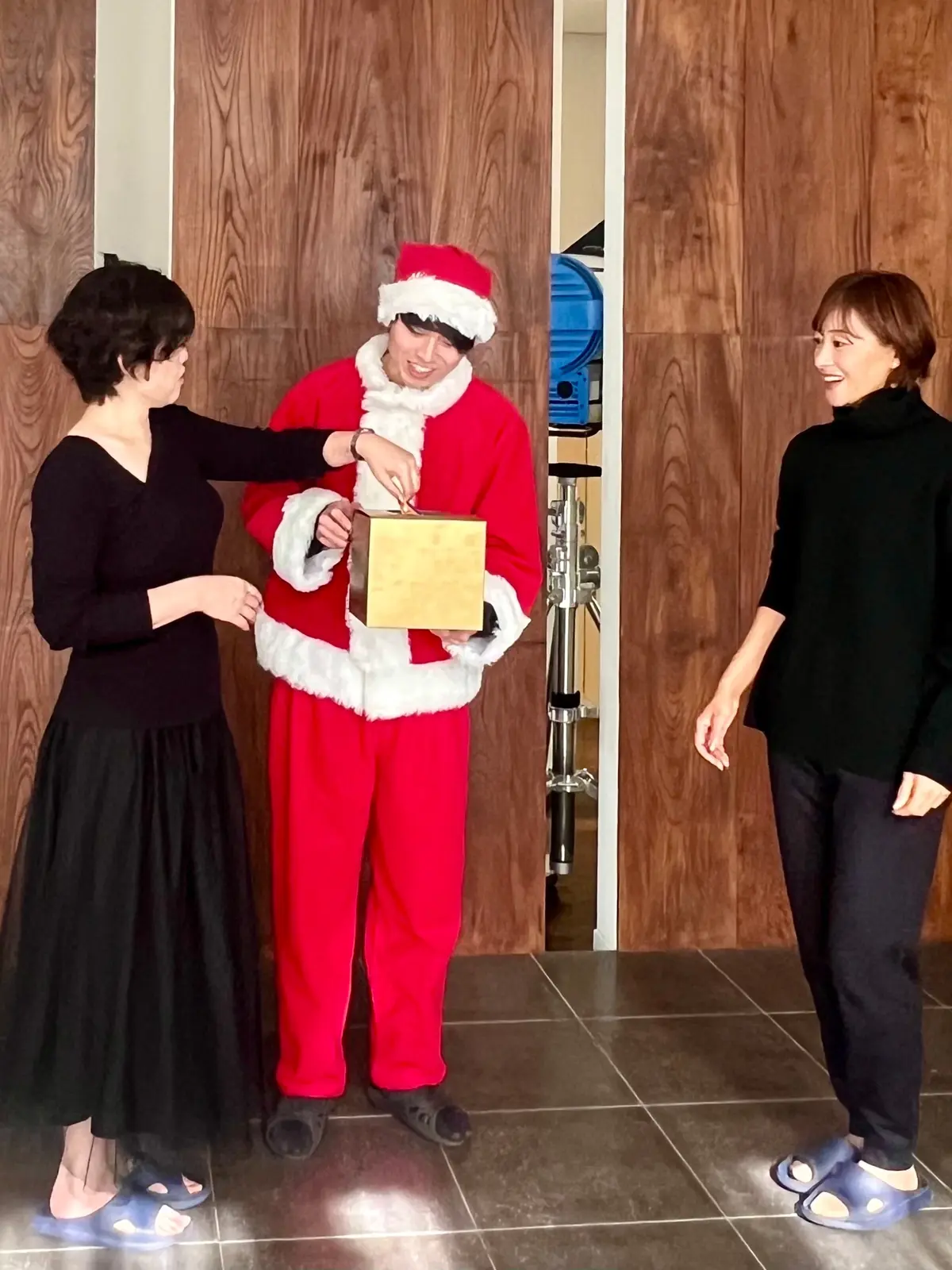 撮影が無事に終わり、ホッとして着替えていると…なんと、さっきまでカメラマンさんの助手をされていた男性が、サンタさんに変身してサプライズ登場!