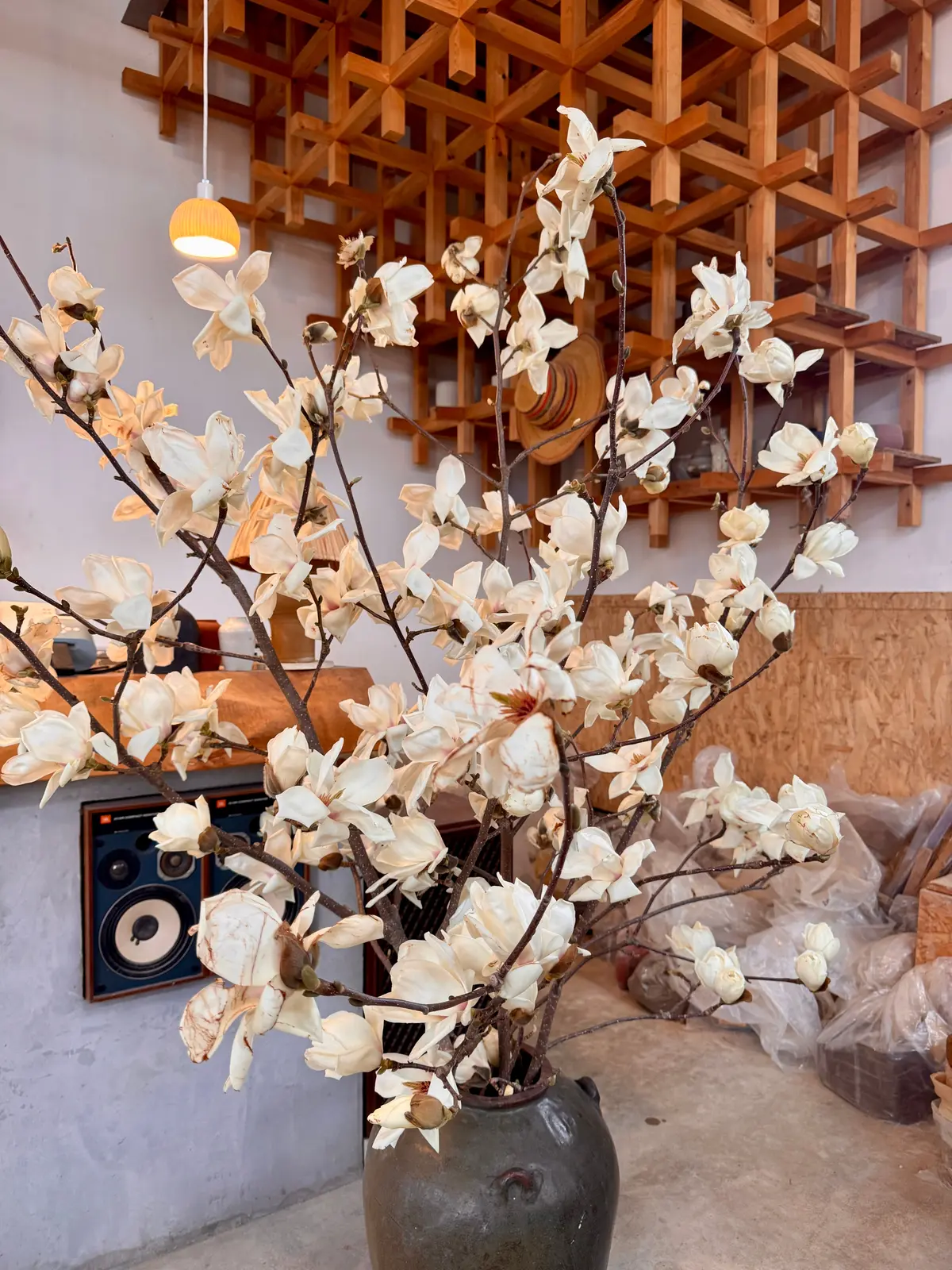 工房の空間を彩る、柔らかな光を放つペンダントライト。実は、こちらのライトも先生の手による作品です。
