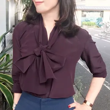 私が一目惚れしたのは深いボルドーのボウタイブラウス。この色は大好きな色。そしてとろみ感も絶妙です。ボウは写真のようにリボン結びにしても、首元にくるくる巻いてもと色々な表情が楽しめそう。