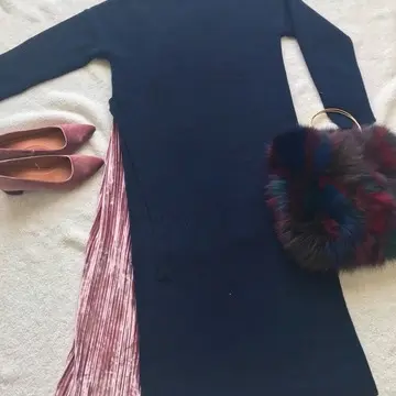 ニットワンピは鮮やかなグリーンが気に入って。ターコイズブルーとフォレストグリーンの中間のような色で顔映りも良くなります。ウエストゴム&プリーツスカートなので着ていて楽でシルエットも綺麗。