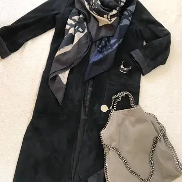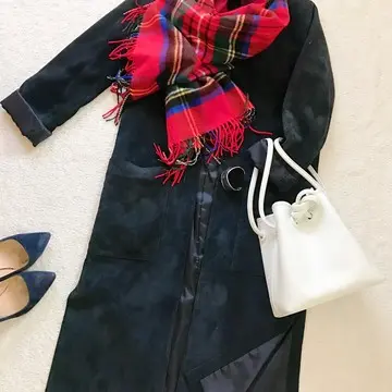 この日はざっくり白タートルニットに大判カシミアストールを合わせて。これは普段一番よく着ている組み合わせかも。ストールは色違いで何枚か持っていますが、やっぱりこの赤が一番好き♡コートはスエードなのでニュアンスがあって、丈はたっぷりあるけどサイドスリットで足元軽やかなところが気に入ってます。