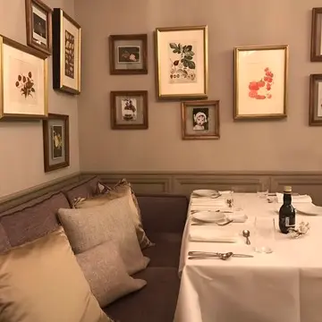 奥のソファー席はゆったりしていて、壁の色もフレームのレイアウトも絶妙。