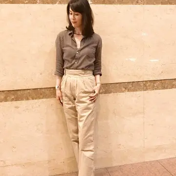 ハイウエストで腰回りはゆったりめ、脚はそのままでも折り返してもOK(実は由夏さん直々に裾を折っていただいた汗)。生地はしっかりしていて肉感を拾わず私たちエクラ世代にも嬉しい限り。