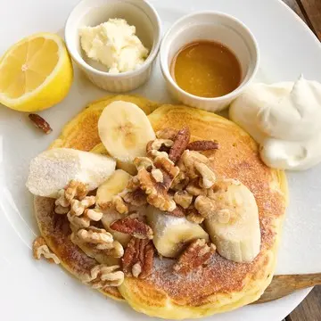 左はブルーベリーチーズケーキ、そして右がパンケーキ。バナナとくるみをトッピングして。ほかにも健康にこだわったメニューなどたくさんありますよ。