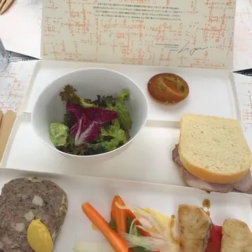 10階のレストラン「ベージュ アラン・デュカス東京」がプロデュースする軽食です。包みを開けるとシャンパンベージュのツイード模様が現れて、ちょっとしたピクニック気分。