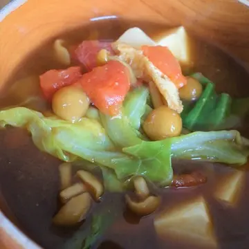 春キャベツとトマトのお味噌汁。味噌とトマト、意外な組み合わせですがとても美味しいです。
