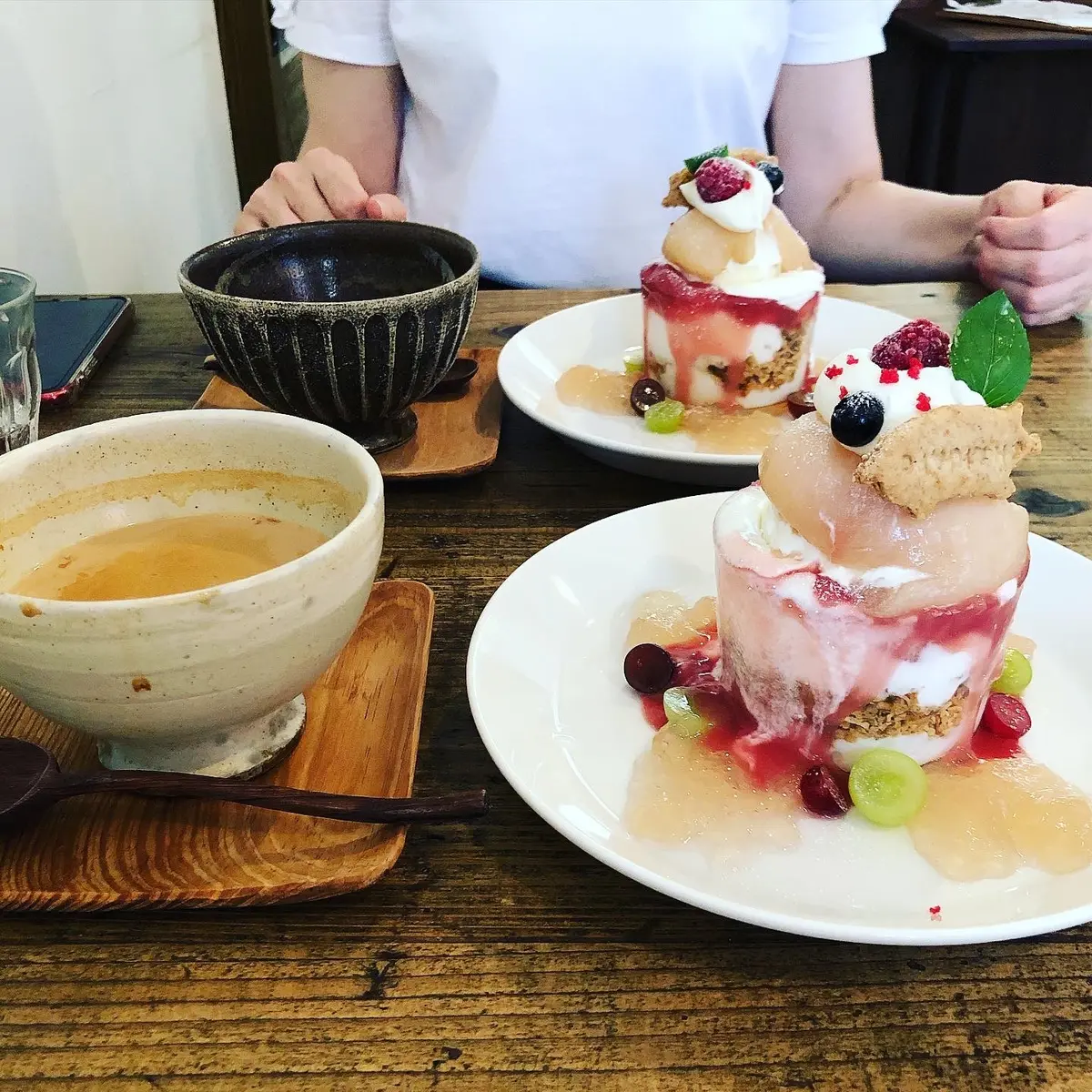 フリンジbagとシアーシャツワンピで、自転車でさくっと。どうしても食べたかった桃パフェ、今年は食べることができました♩