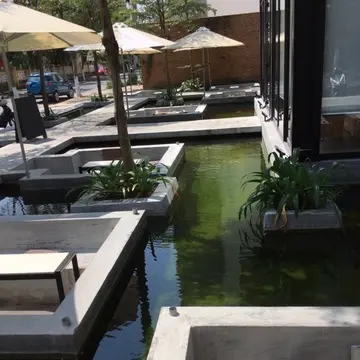 オープンテラスがあって、池には魚が泳いでいます。