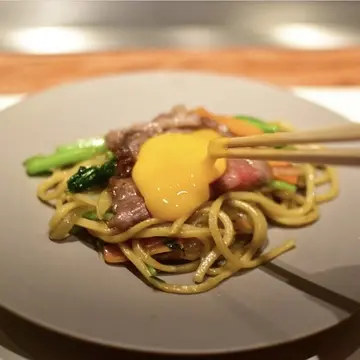 最後の〆の「すき焼き焼きそば」はコシのある太麺に生卵をからめていただきます。
