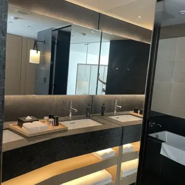 家族や友人と泊まっても洗面台が二つなのも便利。