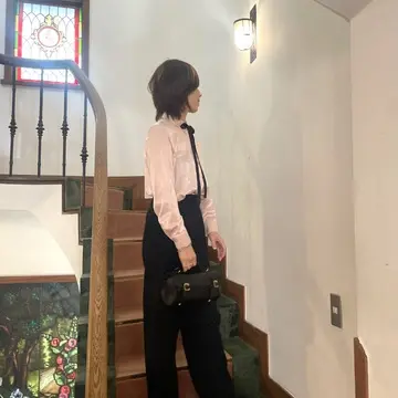 最後は今回のコーデをご紹介。顔映りの良い光沢のあるピンクシャツに長いブラックリボンが可愛いシャツに、ブラックパンツで締めました。ソックスをチラッと見せてローファーに合わせるのは私の定番スタイル。