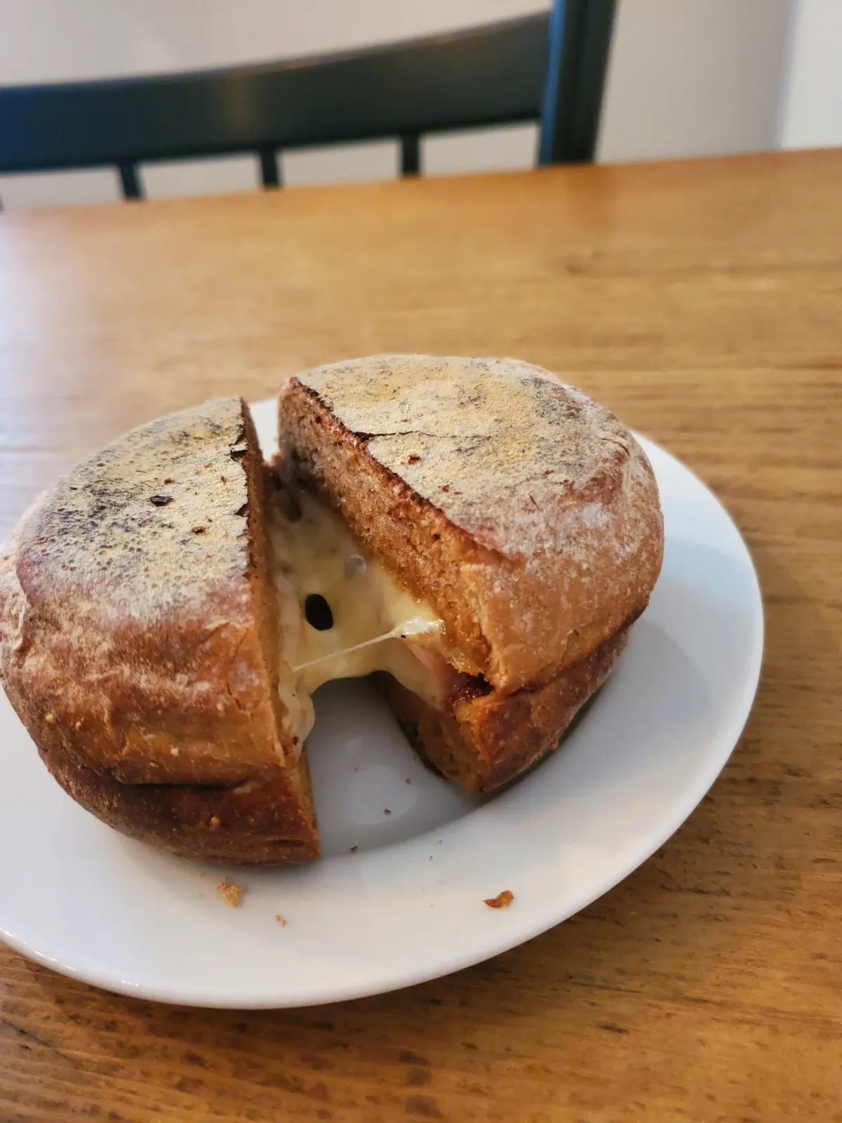 カリッと焼かれていて、ハムチーズをサンドしたものか、蜂蜜バターを選べます。