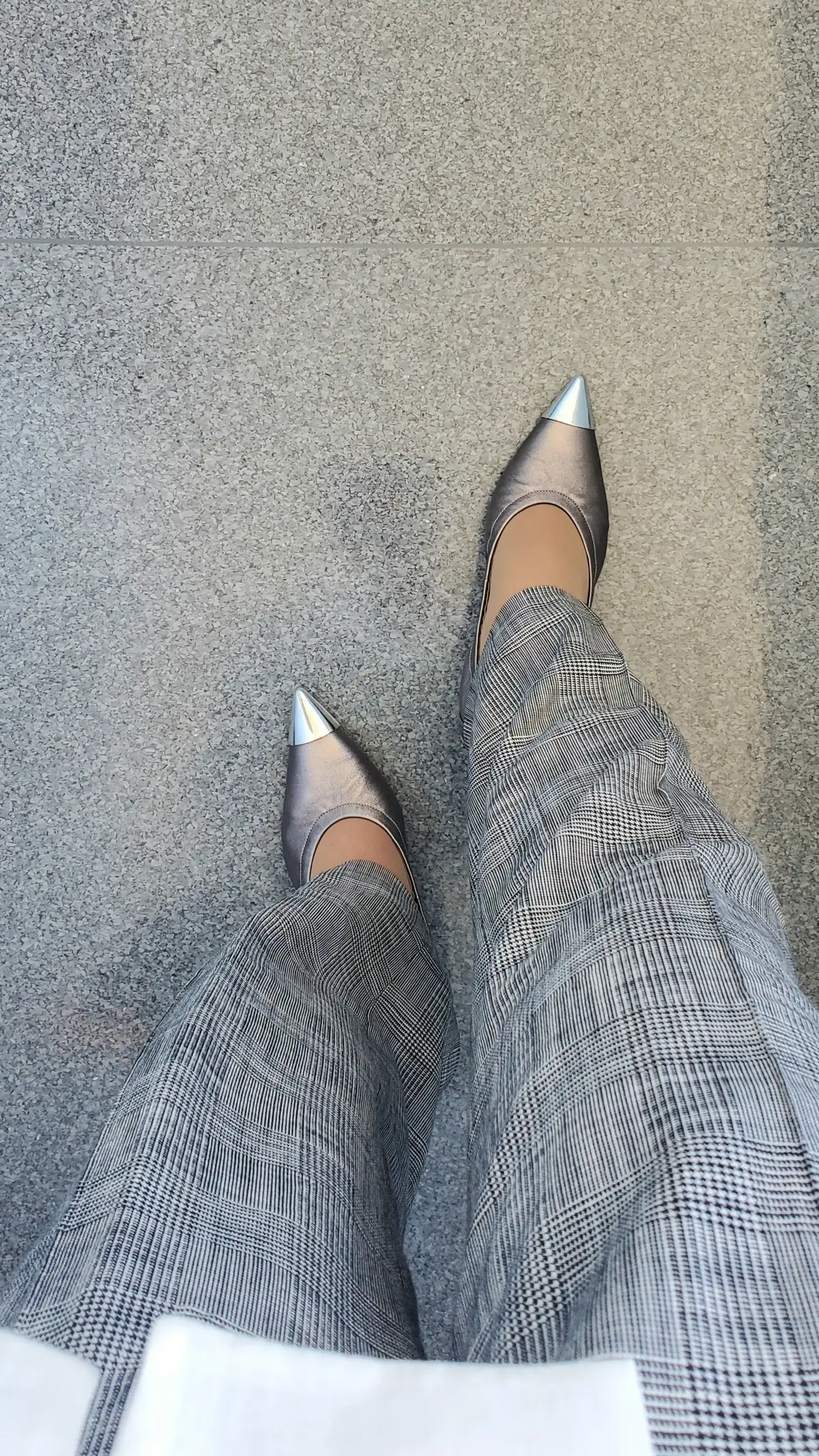 足元はシルバーのパンプスで少しだけモードに。