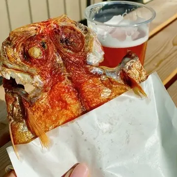桜アイスに桜ビール、そしてビールのお供に金目鯛の開きの素揚げ。