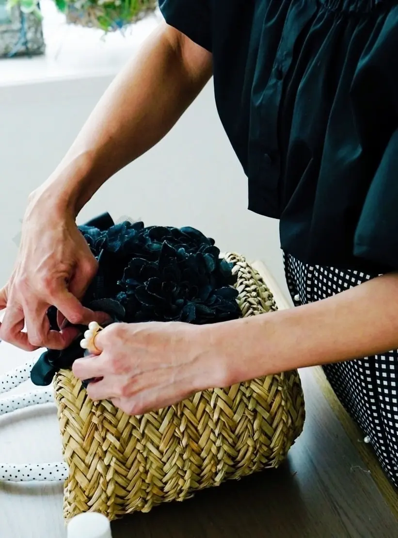 ブラックのデニムフラワー、リボン、チュールを組み合わせて作るデニムフラワーバッグ。