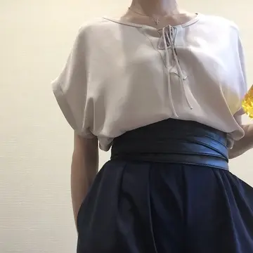 反対側はラウンドネックになっています。鎖骨がいい感じで見える深過ぎず浅過ぎないエクラ世代が綺麗に見えるライン。こちら側はレースアップになっているので、ボトムが主張するものを合わせたので、アクセサリー等合わせにくい時にこのレースアップが活躍してくれます。