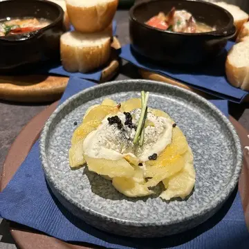 以前から行きたかったお店で,お通しの食べ放題サラダ、鴨ネギトロと雲丹のお寿司、ベイクドポテト、アヒージョもパスタもピザも、、全て美味しかったです♡ワイン好きには絶対オススメのお店!