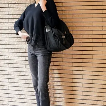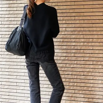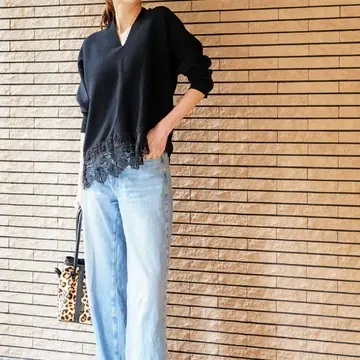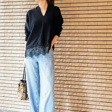 レース部分があるので、バックスタイルはお尻が隠れる長さです。レースに透け感があるので全然重くないし、むしろヒップが隠れる分、パンツスタイルはすっきり見えて脚長効果があります!デニムをウォッシュド加工のブラックでグラデーションを出してみましたが、ブルーでもホワイトでも合わない色はないので、たくさんの着回しが出来る事間違いなしです。