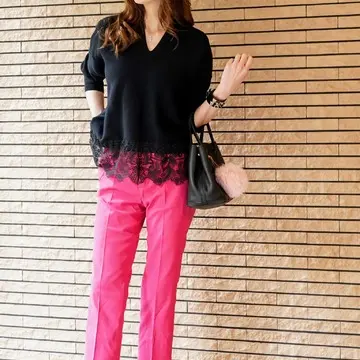 友人とお茶する日、元気にビビットカラーのパンツを合わせて見ました。パンツのピンクに目が行きますが、ニットの黒レースの存在が際立つコーデになったと思います。時計やバングルをしても9分袖なのでもたつかないし、着痩せしてすっきり見えます!