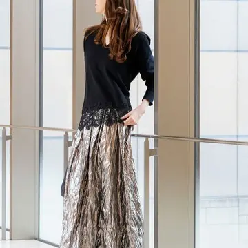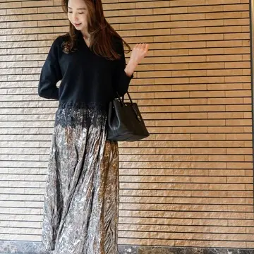 最近購入した存在感たっぷりのロングスカート。シャンパンゴールドが派手なのでニットが負けちゃうかな?と思って着てみたら、、そんな事なかったです(笑)レースの存在感大です!