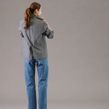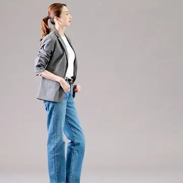 デニムコーデ最後はユニクロのテーラードジャッケットのグレーを羽織ってみました。インナーはソフトリブクルーネックです。