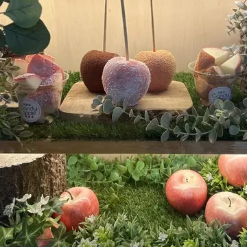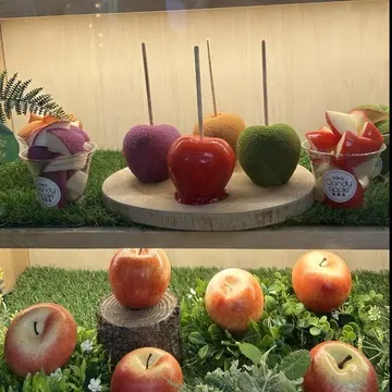 りんご飴なのですが、屋台で食べるものとは違い飴が薄くコーティングされているだけで食べやすいんです❗️
