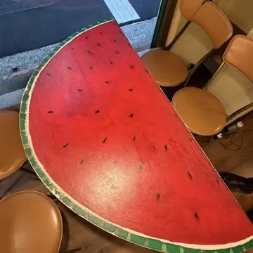 果物屋さんの中がカフェになっています✨店内にはかわいい果物のテーブルがいくつかあって、私達はすいかテーブルへ✨