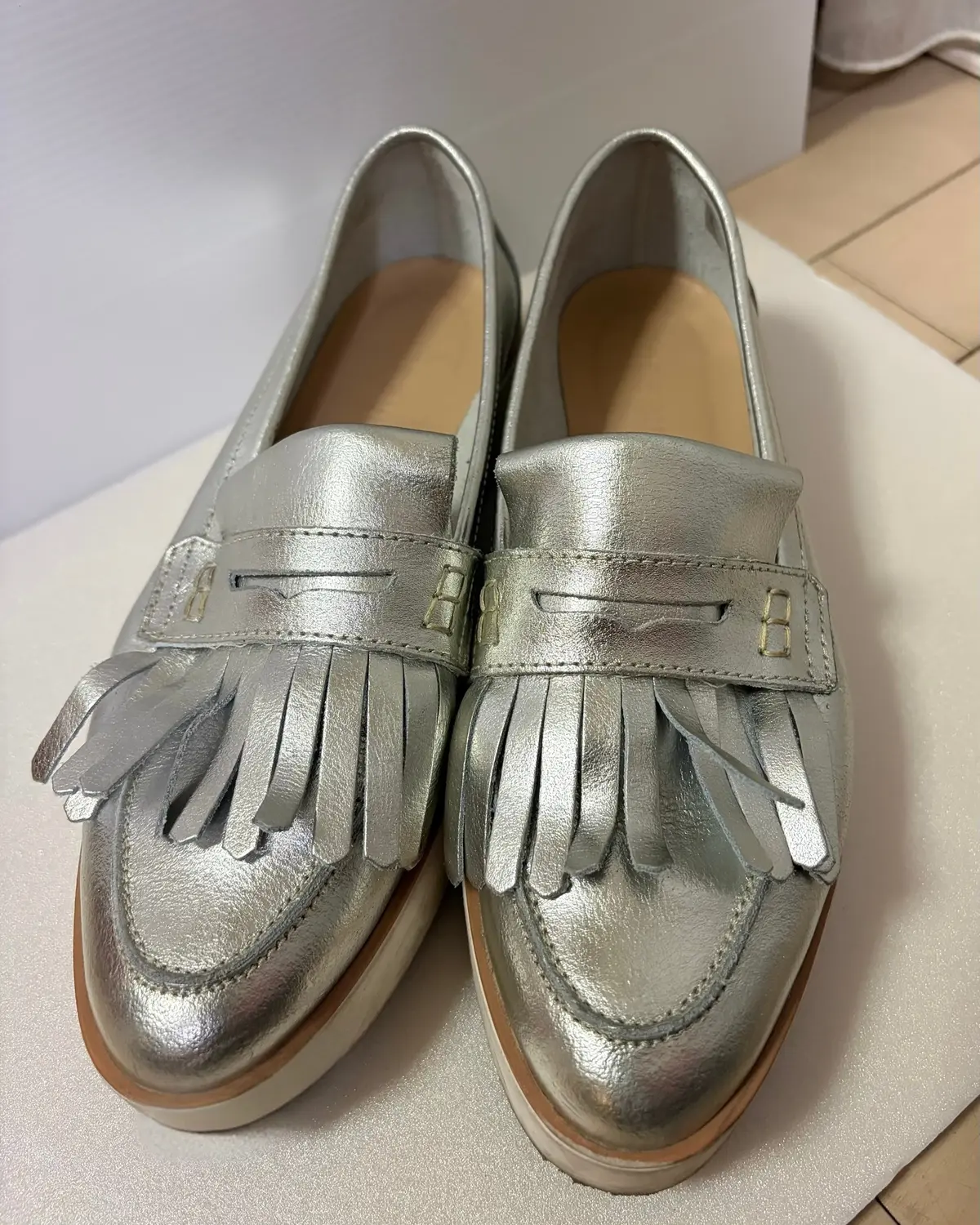 靴はシルバーのフリンジが付いたローファーを合わせました。