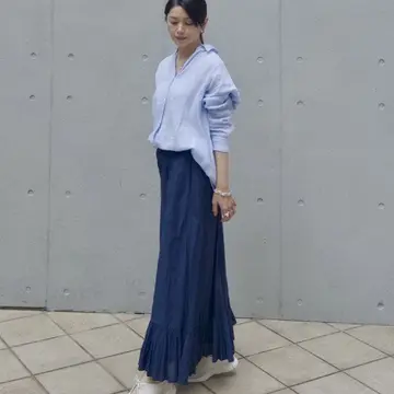 軽やかなシャツとスカートを合わせると、カジュアルだけど女性らしい柔らかな印象になります。