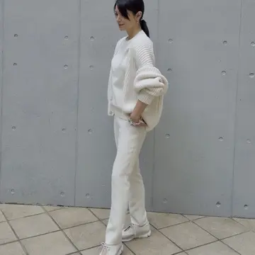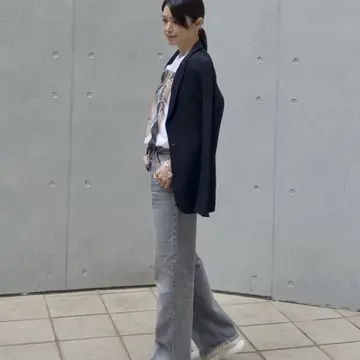 ワイドパンツを合わせると、足長効果抜群!また、ジーンズに真っ白なスニーカーだとカジュアルになり過ぎてしまいますが、このニュアンスグレーが品のある大人コーデにしてくれます。