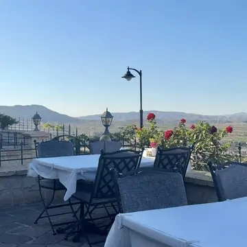 景色のいいテラス席でのお食事。朝晩は涼しいのでブランケットをお借りして。はい!白ワインで上機嫌です!そう、ワインの産地としても知られているカッパドキア。もちろん!ワイナリーにも寄りましたよ。