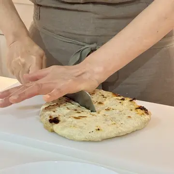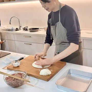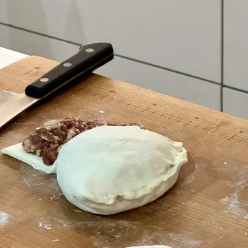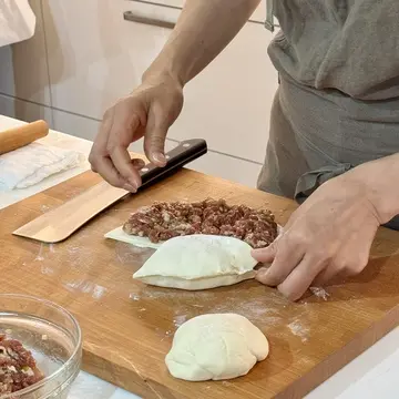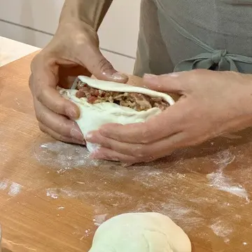 4分の1のスペースを空けて、餡をのせていないスペースに包丁で中心から切り込みを入れて、生地を優しく抱えながら90度に折り餡にかぶせ、縁を閉じていきます。そこからさらに90度餡ごと生地を折り、さらに折り3層に。先生のお見事な包み方に感動してしまいました。