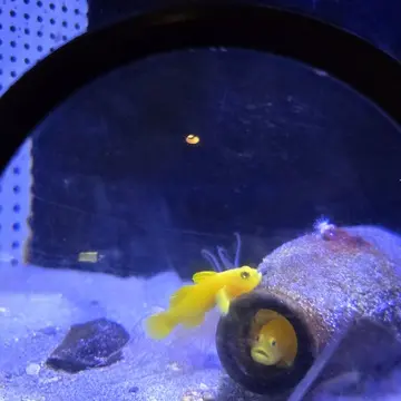 黄色い小さいさかな君。近くに虫眼鏡があって観察できます。