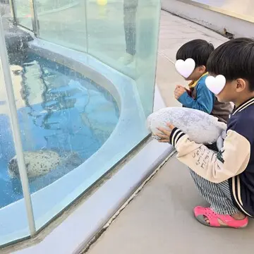 風が冷たくて強く、お兄ちゃんは相棒のアザラシ君を懐に入れて温めてあげています♡
